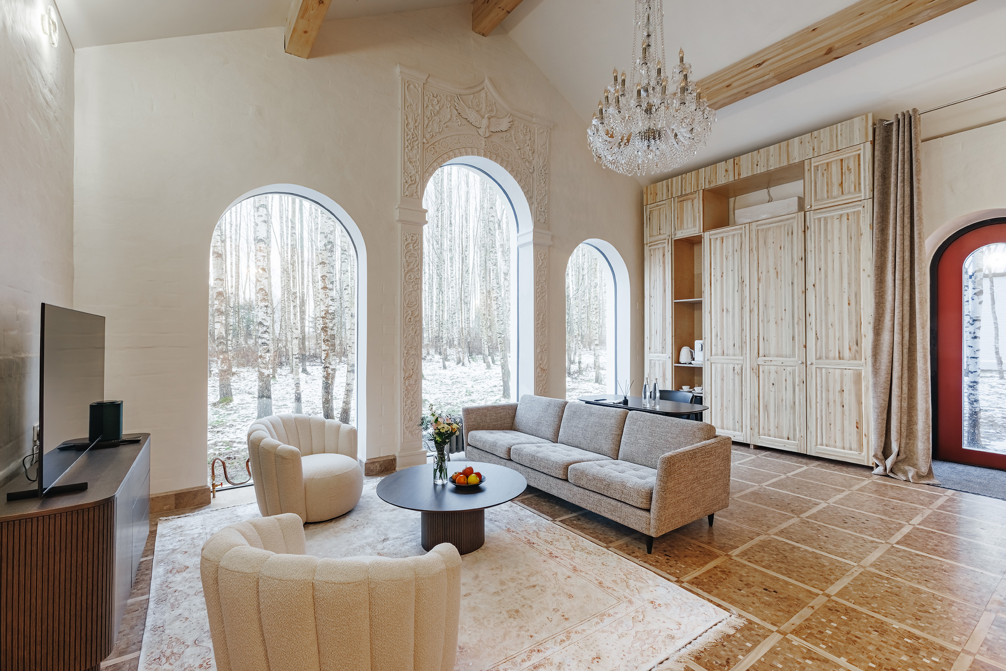 Отель подходит как для уединённых выходных, так и для свадеб, и ретритов. Летом — бассейн, пляж, сапы и велопрогулки, зимой — лыжи и тюбинг. Работает тренажёрный зал, а летом 2026 года откроется и SPA-комплекс.