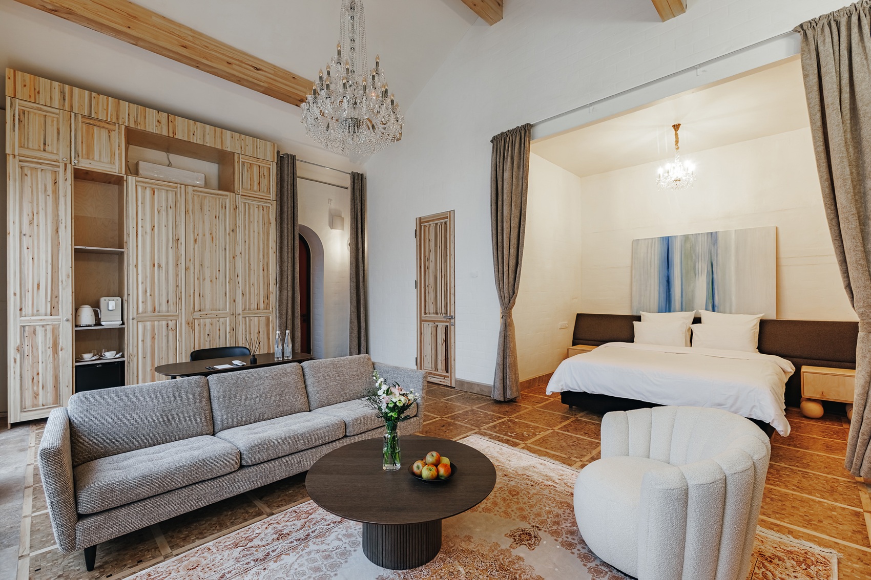 Гостям доступны 27 коттеджей — от лаконичных люксов до просторных двухэтажных домов с парными, террасами и зонами BBQ. Панорамные окна стирают границу с природой, а интерьер строится на натуральных материалах и авторских деталях: ручные ковры, винтаж и искусство, органично вписанное в пространство.